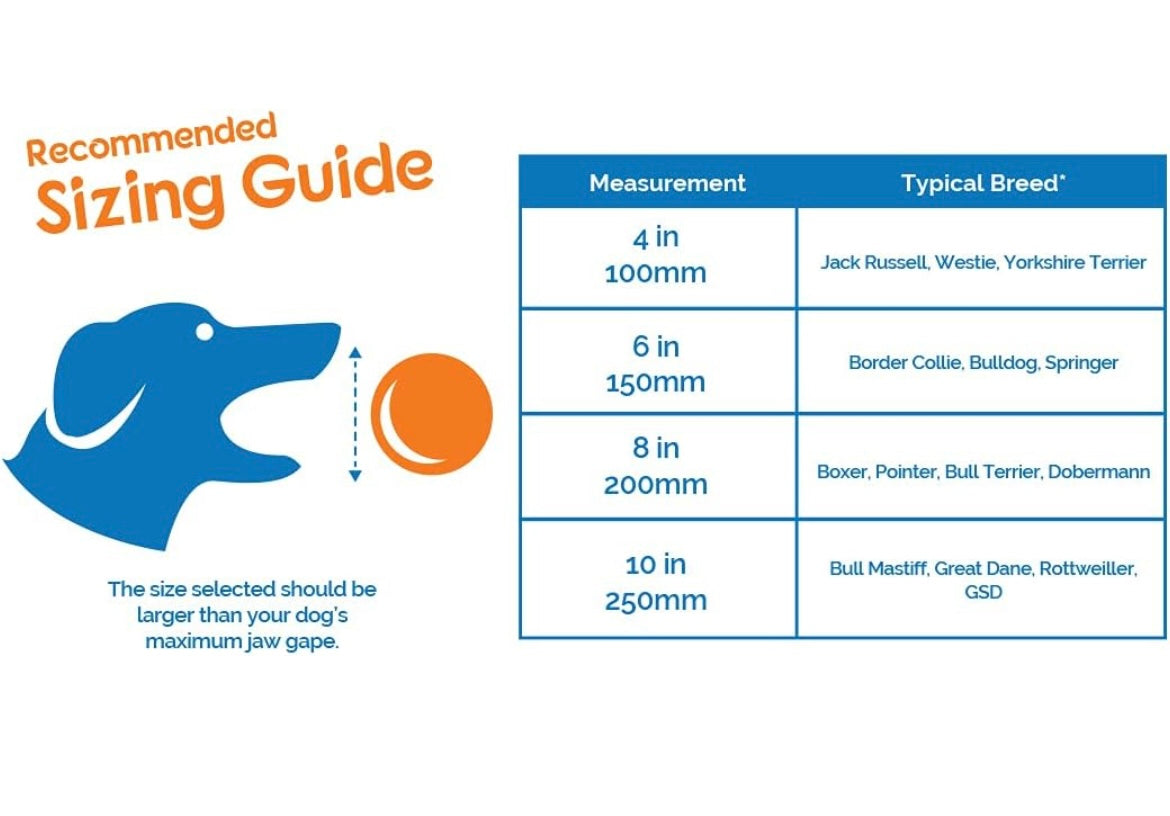 - CONSIDER SIZE - The toy is designed to not be picked up by the dog, so the ball should be a size bigger than the dog can carry