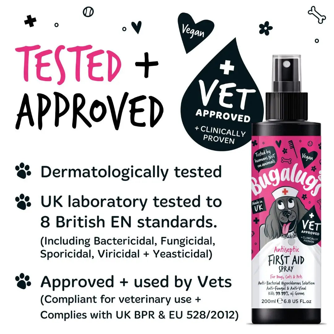 Bugalugs Pet Care Antiseptic First Aid Spray has been tested rigorously to ensure it is the highest standard whilst still safe for use on your pets skin. The unique formula has been approved by vets and Complies with UK BPR & EU 528/2012. Approved Veterinary use. Independently tested to the following standards EN 13697, EN 1656, EN 1276, EN 13704, EN 14476, EN14204, EN13727 & EN1650. Compliant for veterinary Biocidal use.