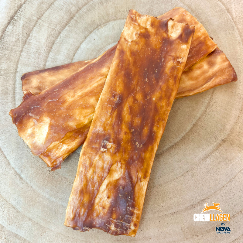 Chewllagen is a dog treat made from the collagen extracted from South American grass-fed cattle hide. The collagen proteins are hydrolysed and broken down through a heating process into smaller and more easily digestible molecules. The collagen is then shaped and baked where it acquires its bread like texture before being dipped in real beef or chicken.