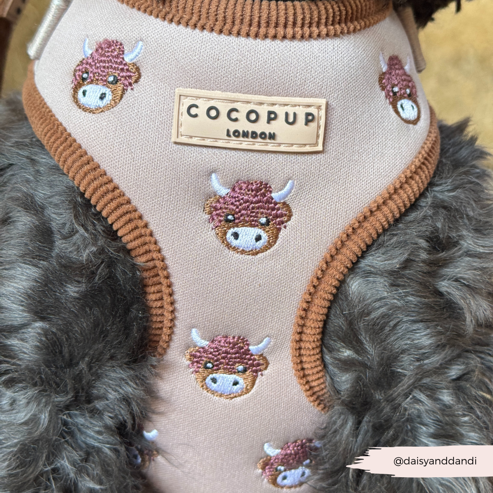 Get your furry friend ready for some country dog walks with Harold the Highland Cow Adjustable Neck Harness! This brown harness features an embroidered design of a cute highland cow and is fully adjustable for a comfortable fit. Perfect for adding some quirky and playful style to your pup's walking gear.
