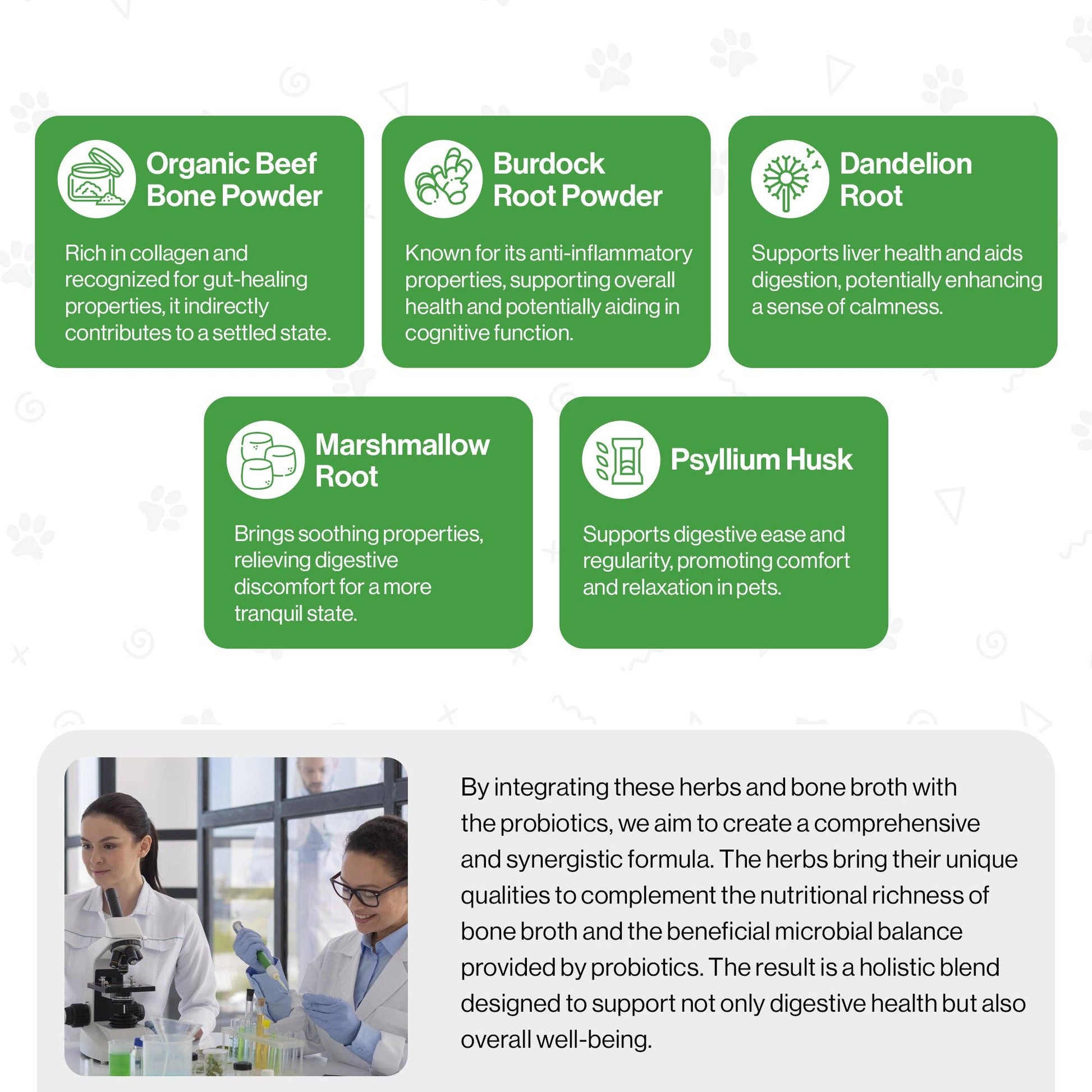 Enriched with organic Beef Bone Broth Powder for joint support and a combination of natural ingredients like Marsh Mallow Root, Burdock Root, and Dandelion Root known for their potential benefits for immunity.