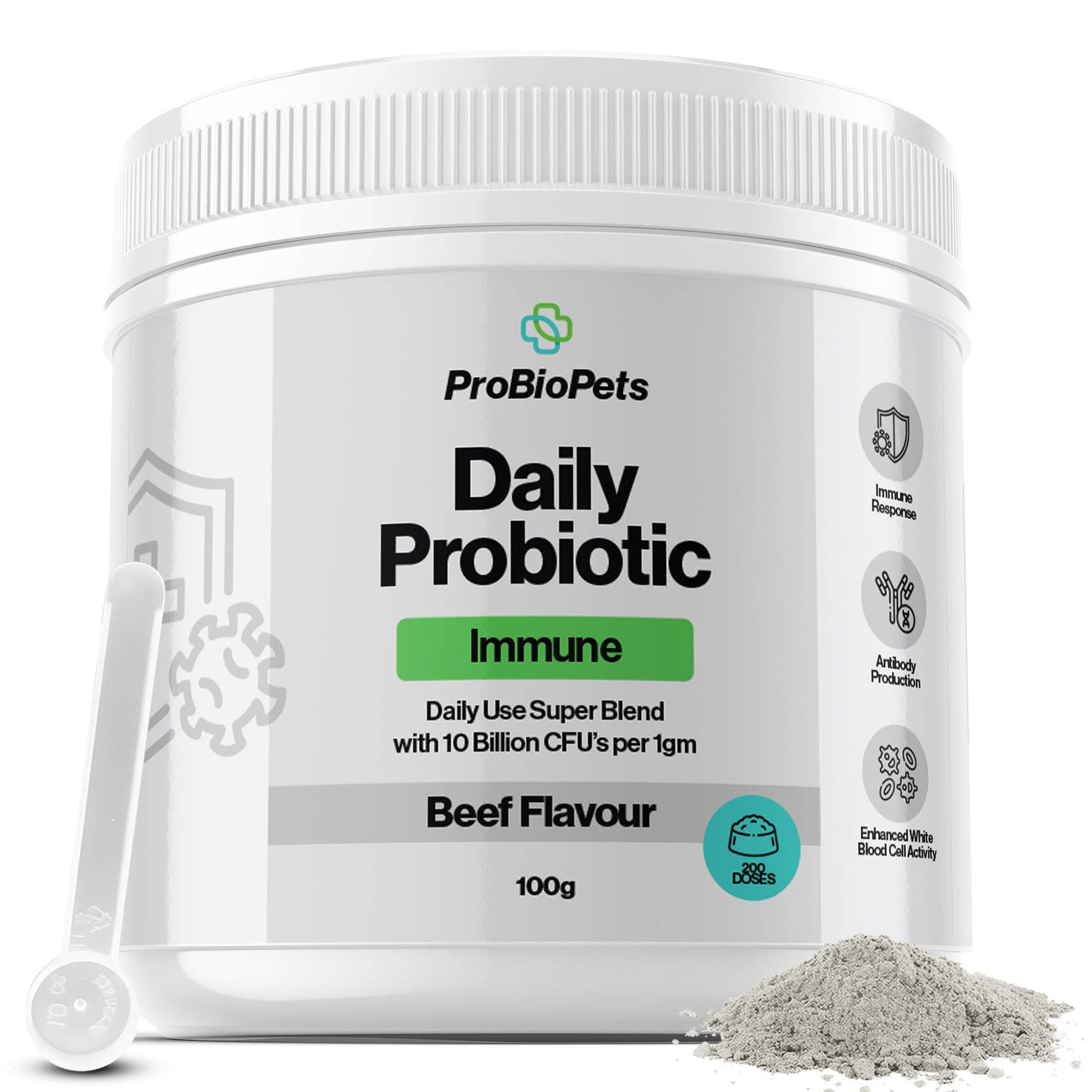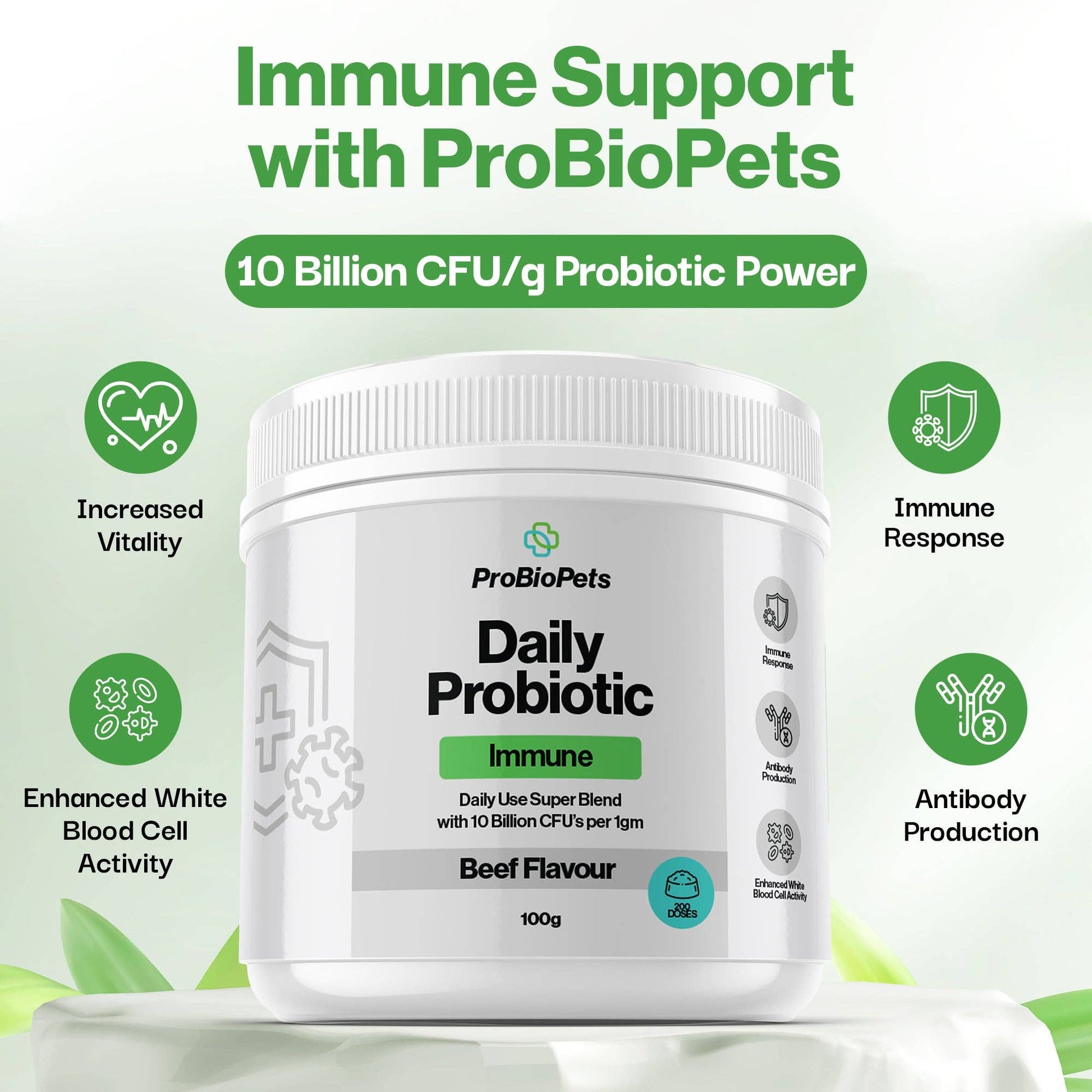 Unleash the power of ProBioPets Immunity Powder, a specially crafted blend designed to support your pet's immune system's health. Packed with 10 Billion CFU/g of powerful probiotics, known to support gut health and immune function.