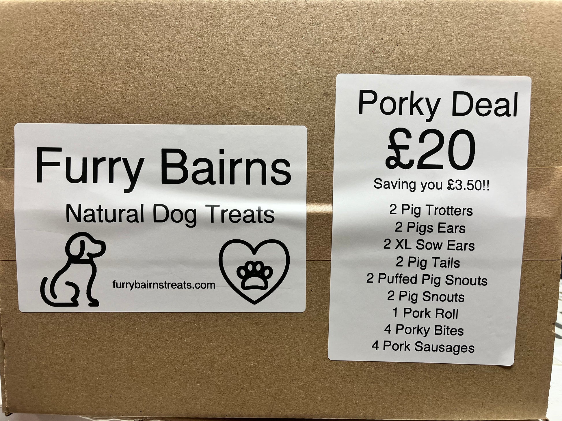 2 Pig Trotters, 2 Pigs Ears, 2 XL Sow Ears, 2 Pig Tails, 2 Puffed Pig Snouts, 2 Pig Snouts (not puffed), 2 Pork Roll, 2 Porky Bites and 2 Pork Sausages