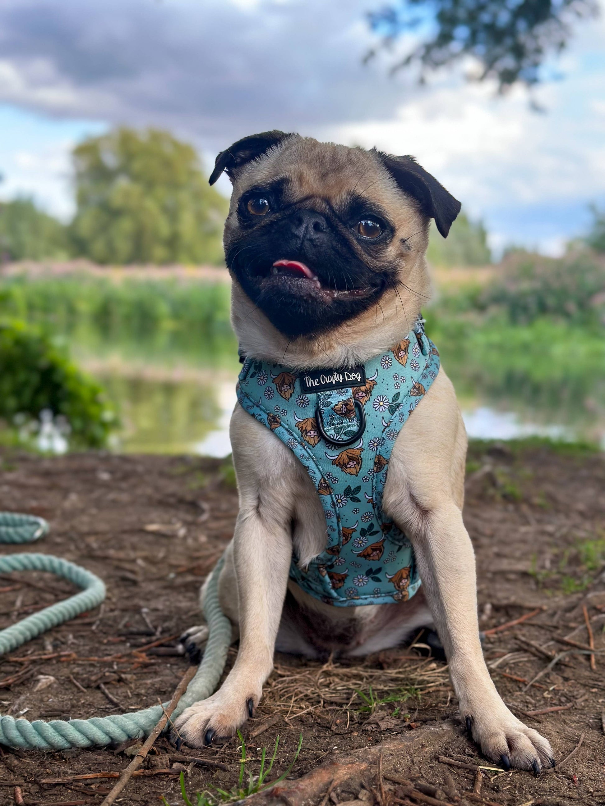 Welcome "The Crafty Cow" adjustable dog harness to the pack: Our adjustable vest harnesses can be made bigger or smaller in a matter of seconds perfect for going over cool coats or rain jackets!